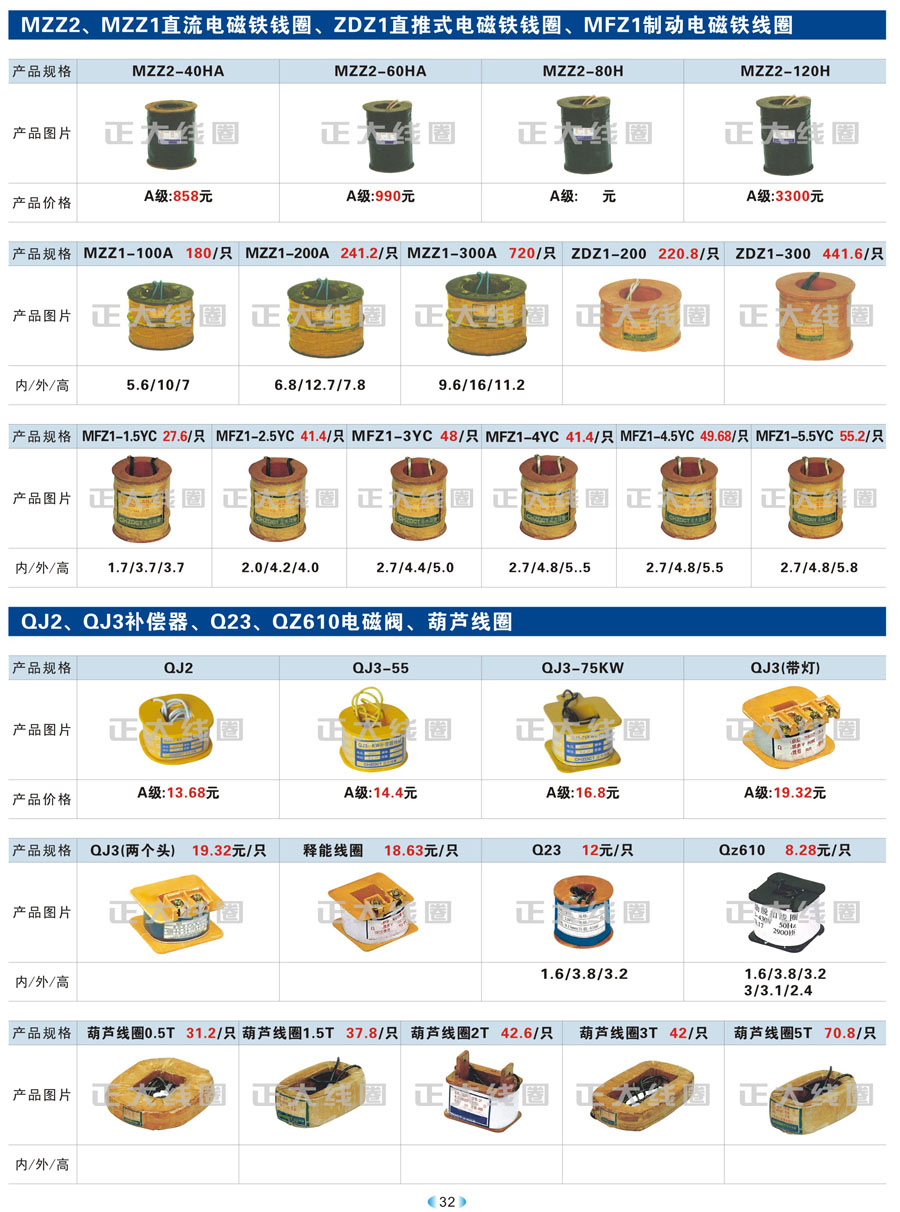 MZZ2、MZZ1直流電磁鐵線圈、MZD1直推式電磁鐵線圈、MFZ1制動(dòng)電磁鐵線圈、QJ2、QJ3補(bǔ)償器、Q23、QZ610電磁閥、葫蘆線圈 ?
